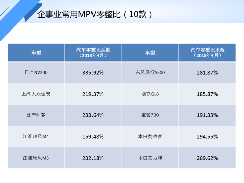 企事业常用车型零整比(2018年4月)