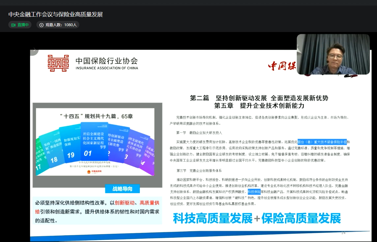 为帮助各会员单位深入学习贯彻中央金融工作会议精神,聚焦主责主业,推动保险业高质量发展,进一步发挥保险业在加快金融强国建设中的作用,12月15日,飘花影院电影免费观看第267期中国保险大讲堂顺利举办,保险公司总部及分支机构、地方保险行业协会共1200余人参加线上学习。本次大讲堂主题为“中央金融工作会议与保险业高质量发展”,中信建投首席政策分析师胡玉玮和北京工商大学中国保险研究院副院长宁威进行授课。