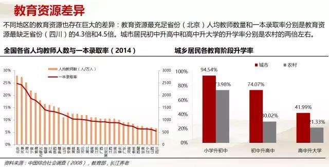 教育资源差异。不同地区的教育资源也存在巨大的差异:教育资源最充足省份(北京)人均教师数量和一本录取率分别是教育资源最缺乏省份(四川)的4.3倍和4.5倍。城市居民初中升高中和高中升大学的升学率分别是农村的两倍左右。