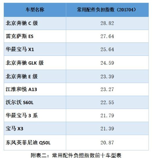 常用配件负担指数方面,在汽车零整比系数基础上,挖掘事故车维修数据,选取配件损失率大于1%的常用配件进行研究,导入计算公式核算各车型的常用配件负担指数。在样本车型中最高的车型为北京奔驰C级,常用配件负担指数为28,82;最低的车型为哈弗H6,常用配件负担指数为9,32。 飘花影院在线观看。